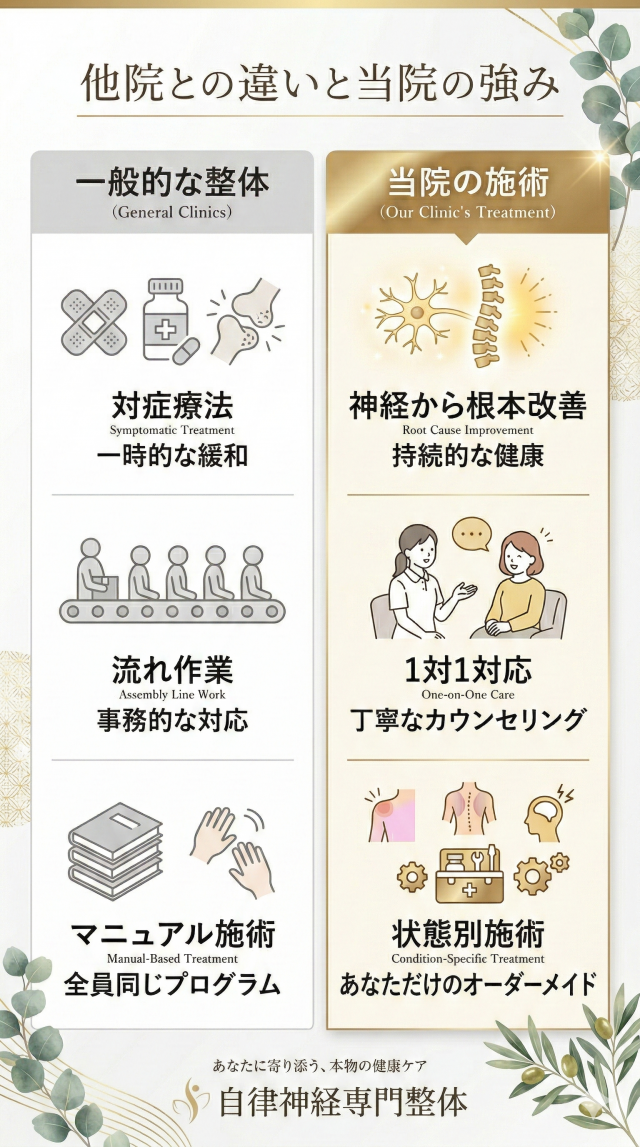 → 骨格・筋肉・神経系バランスを総合的に整える独自の手技